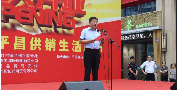 中共平昌縣縣委副書記曹光輝代表平昌縣委、縣政府致辭。他指出,省供銷社及直屬集團公司對平昌縣供銷社給予了高度重視和大力支持,2021以來,向平昌縣支持了綜合改革、農(nóng)業(yè)社會化服務(wù)、茶葉產(chǎn)業(yè)等6個項目,投入項目補助資金1311萬元,使平昌成為首個全省供銷系統(tǒng)為農(nóng)服務(wù)綜合平臺建設(shè)試點縣。他認為,“老鄰居•平昌供銷生活超市”的順利開業(yè),標志著平昌供銷為農(nóng)服務(wù)綜合平臺試點縣建設(shè)取得了重要成果,也預(yù)示著“老鄰居”品牌在平昌這片熱土上的新生,這一創(chuàng)新舉措既是強基固本、優(yōu)城興業(yè)的生動體現(xiàn),更是開放合作、守正創(chuàng)新的具體實踐。他強調(diào),“老鄰居•平昌供銷生活超市”連鎖網(wǎng)絡(luò)的問世,給平昌人民提供了大量的就業(yè)崗位,彰顯出“保供、保質(zhì)、穩(wěn)價”公有制企業(yè)特性,為平昌經(jīng)濟社會帶來了全新的物流業(yè)態(tài)和消費時尚。他表示,要以省市供銷社對平昌縣的重視和關(guān)懷為契機,以《四川省供銷合作社條例》為準則,以“兩個加快”為抓手,主動擔當作為,全面推進供銷合作社綜合改革,奮力推動供銷合作事業(yè)高質(zhì)量發(fā)展。
