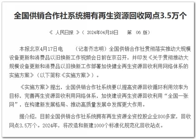 全國(guó)供銷合作社貫徹落實(shí)推動(dòng)大規(guī)模設(shè)備更新和消費(fèi)品以舊換新工作視頻會(huì)日前在京召開(kāi),并印發(fā)《關(guān)于貫徹推動(dòng)大規(guī)模設(shè)備更新和消費(fèi)品以舊換新工作部署加快健全再生資源回收利用網(wǎng)絡(luò)體系的實(shí)施方案》(以下簡(jiǎn)稱《實(shí)施方案》)。