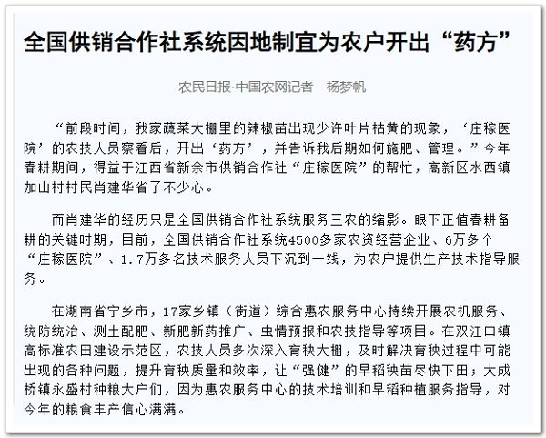 而肖建華的經(jīng)歷只是全國供銷合作社系統(tǒng)服務(wù)三農(nóng)的縮影。眼下正值春耕備耕的關(guān)鍵時(shí)期,目前,全國供銷合作社系統(tǒng)4500多家農(nóng)資經(jīng)營企業(yè)、6萬多個(gè)“莊稼醫(yī)院”、1.7萬多名技術(shù)服務(wù)人員下沉到一線,為農(nóng)戶提供生產(chǎn)技術(shù)指導(dǎo)服務(wù)。